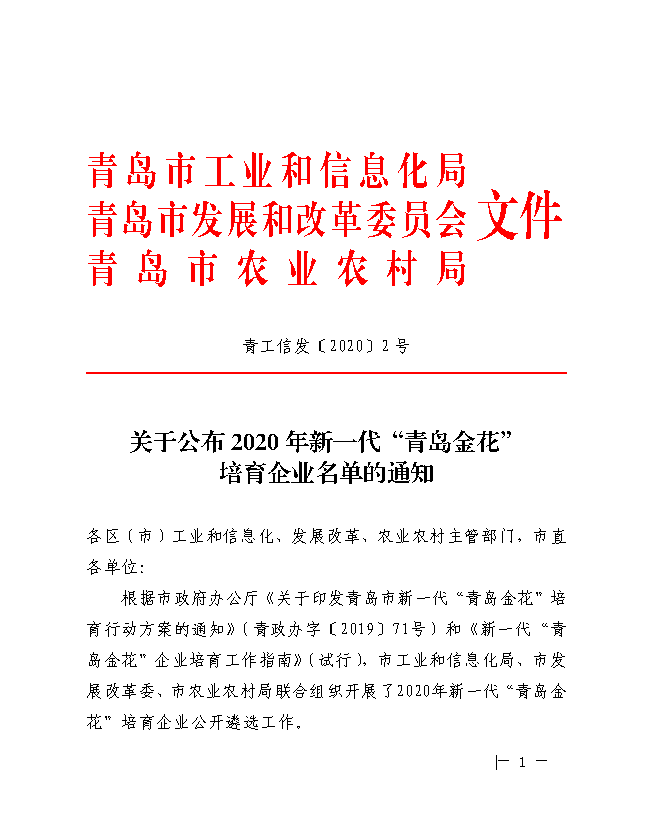 根據市政府辦公廳《關于印發青島市新一代“青島金花”培育行動方案的通知》〔青政辦字〔2019〕71號)和《新一代“青島金花”企業培育工作指南》〔試行,市工業和信息化局、市發展改革委、市農業農村局聯合組織開展了2020年新一代“青島金花”培育企業公開—選工作。