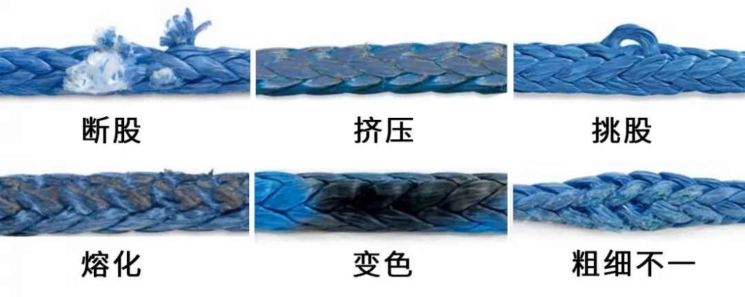 檢查纜繩時,要仔細檢查內部和外部。任何一方磨損時,纜繩都明顯變弱。作為編織繩的一般規則,當因摩擦造成的纜繩磨損≥ 25%或纖維斷裂時,應不再繼續使用。對于雙編繩,護套磨損50%達到報廢標準,對于三股繩,磨損10%達到報廢標準。