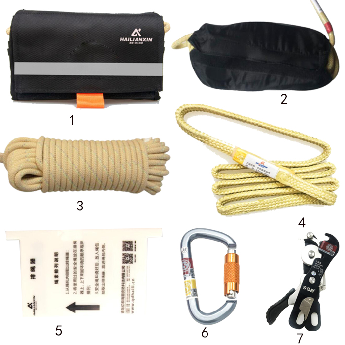 8毫米自救安全繩套裝由多功能繩包、8mm耐高溫自救安全繩16m、輕型安全鉤、可調節下降器一個、6.8mm中空連接扁繩一條和排繩器一個組成。