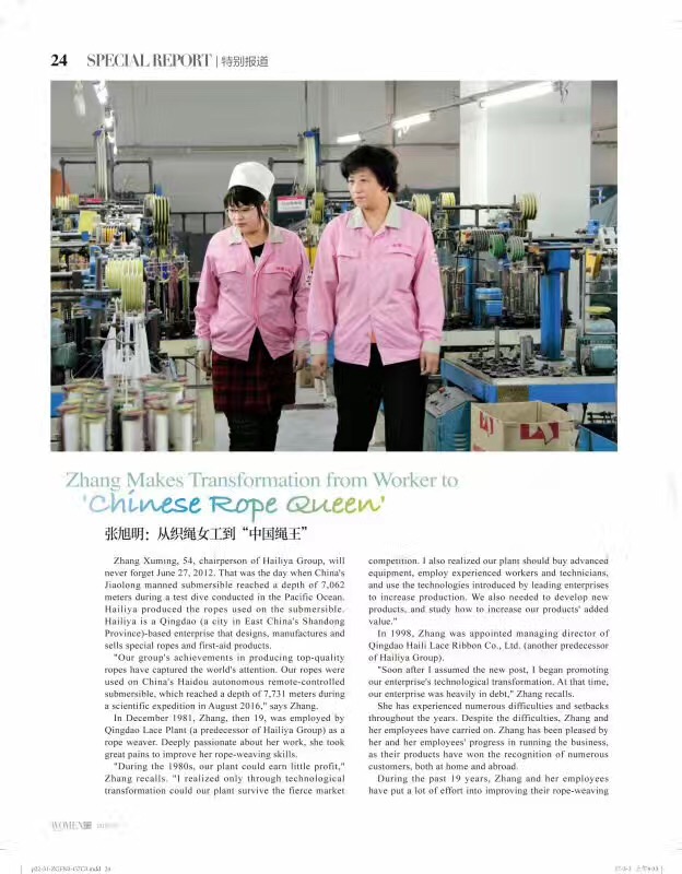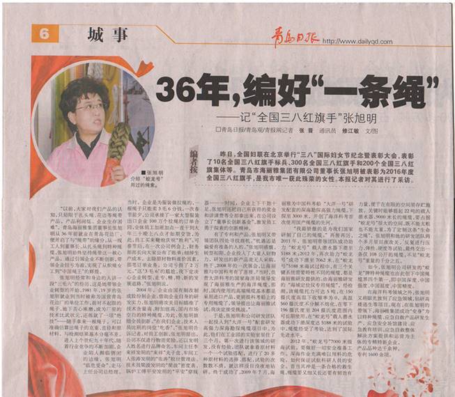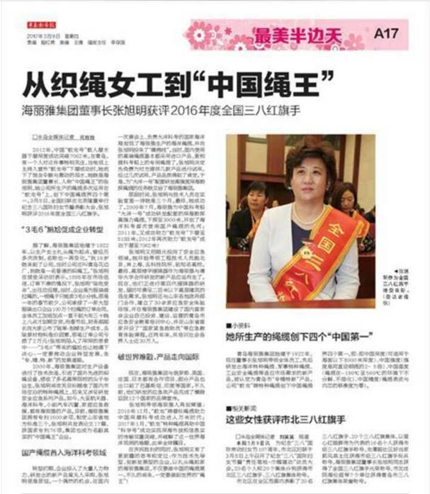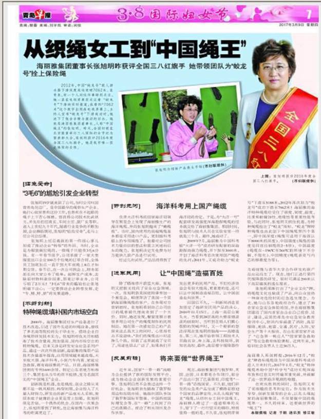 “業精于勤,荒于嬉;行成于思,毀于隨”,用在張旭明身上最貼切。36年的光陰,張旭明毫不吝嗇的奉獻給海麗雅,從織繩女工到“中國繩王”,這背后砥礪前行的痛楚也只有她自己最清楚。但是,路漫漫其修遠兮,張旭明會一直秉持“大國匠心”的理念,將繩纜產業做到極致,要讓自己的繩纜走出國門,站在世界的舞臺上,為國爭光!